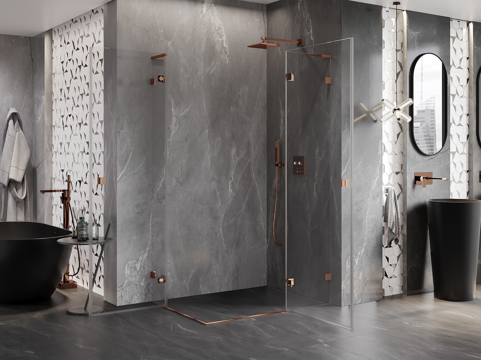 Spaustukai ir vyriai pagaminti iš labai patvaraus žalvario, papildomai sukuriantys lygią stiklo plokštumą. Tai puikus pasirinkimas, jungiantis eleganciją, patvarumą ir šiuolaikinį dizainą. Tokie sprendimai prideda dušo estetikai ir tuo pačiu palengvina švaros palaikymą.