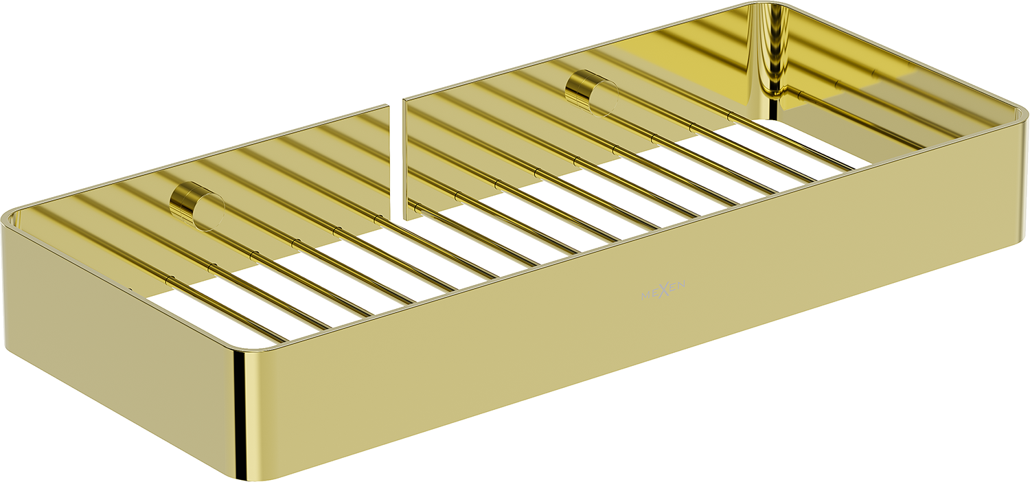 Mexen Evos-L vonios krepšelis aukso spalvos yra elegantiškas ir funkcionalus priedas kiekvienai voniai. Pagamintas iš nerūdijančio plieno AISI 304, pasižymi ilgaamžiškumu bei atsparumu blukimui ir korozijai. Auksinė apdaila suteikia jam prabangų išvaizdą. Produktas yra 29,5 cm pločio, 4 cm aukščio ir 13 cm atstumu nuo sienos, kas daro jį idealiu mažoms erdvėms. Dėl lentynėlėje esančių skylučių, vanduo yra greitai nutekamas, kas padidina jo praktiškumą.
