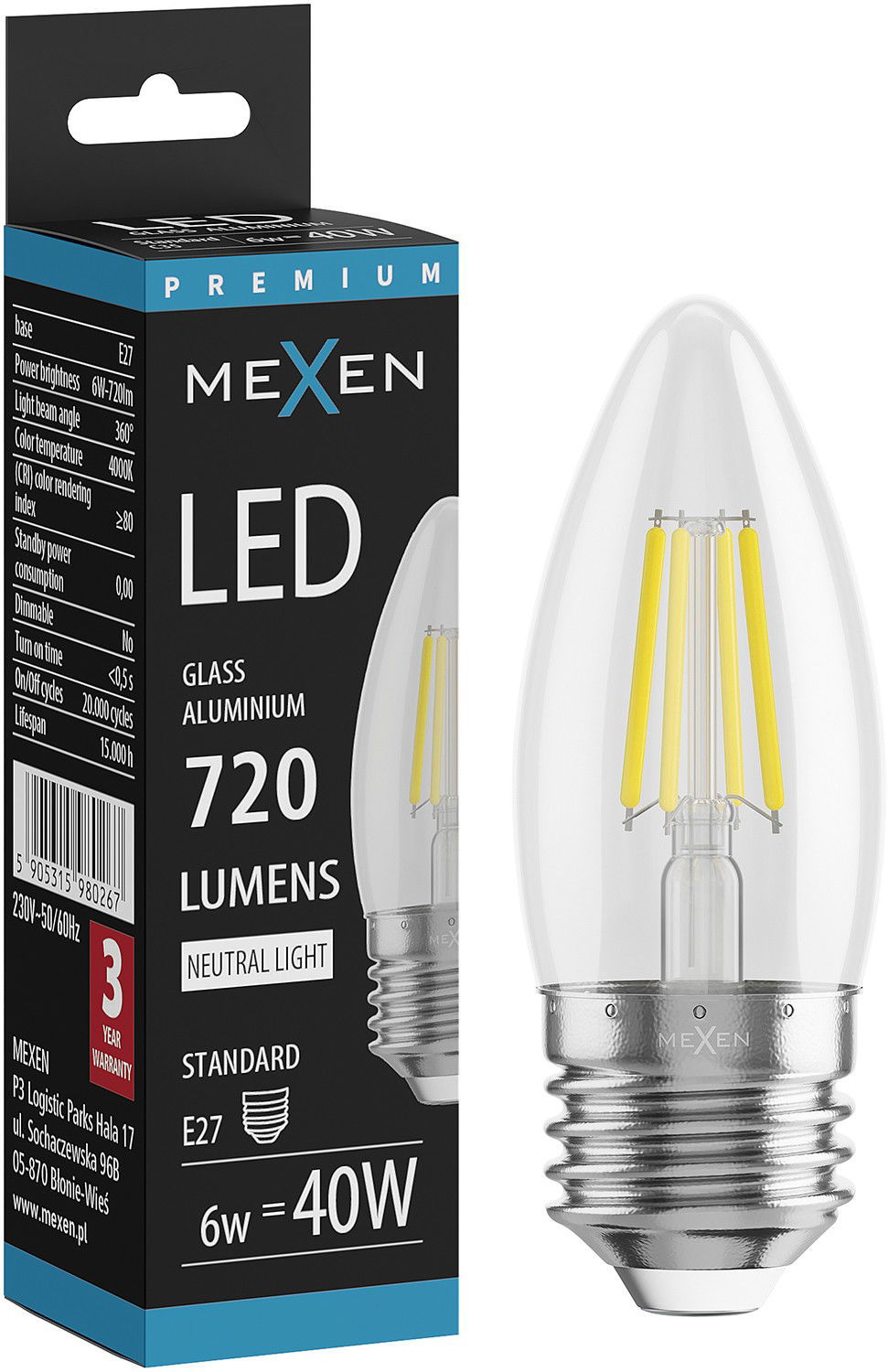Mexen Vintis LED siūlelio lemputė E27, C35, 6W, Neutralus - 4000K, 720 lm, skaidrus - L154-E27-0640-00