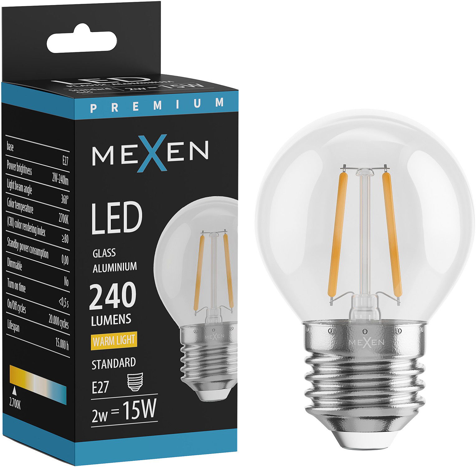 Mexen Vintis LED lemputė filamentinė E27, G45, 2W, Šilta - 2700K, 240 lm, skaidri - L156-E14-0227-00 - L156-E27-0227-00