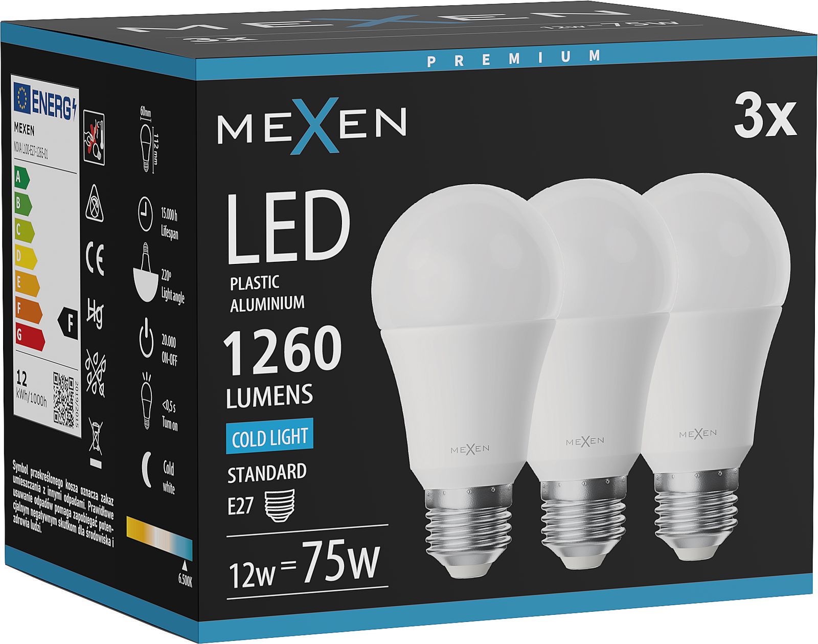 Mexen Nova 3x LED lemputė E27, A60, 12W, Šalta - 6500K, 1260 lm - L100-E27-1265-01x03
