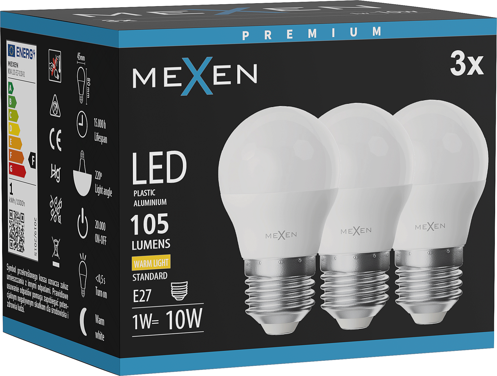 Mexen Nova 3x LED lemputė E27, G45, 1W, Šiltai balta - 3000K, 105 lm - L101-E27-0130-01x03