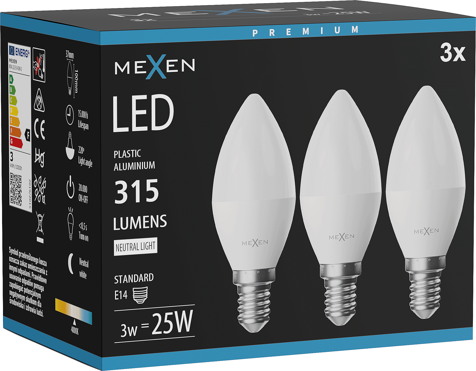 Mexen Nova 3x LED lemputė E14, C37, 3W, Neutrali - 4000K, 315 lm - L102-E14-0340-01x03