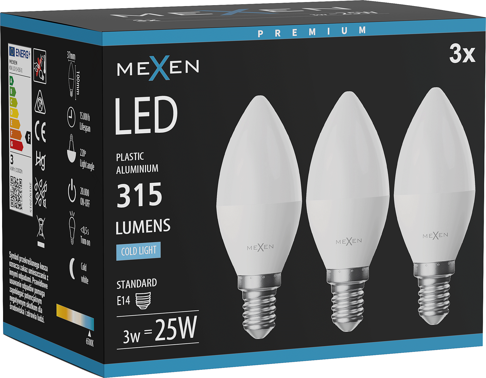 Mexen Nova 3x LED lemputė E14, C37, 3W, Šalta - 6500K, 315 lm - L102-E14-0365-01x03