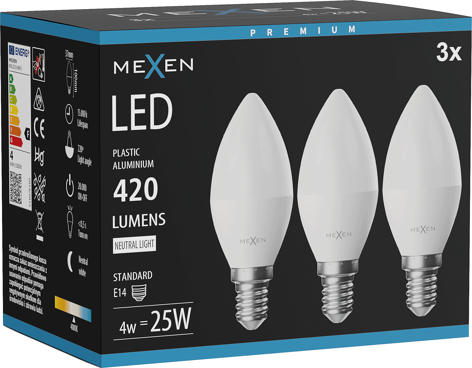 Mexen Nova 3x LED lemputė E14, C37, 4W, Neutralus - 4000K, 420 lm - L102-E14-0440-01x03