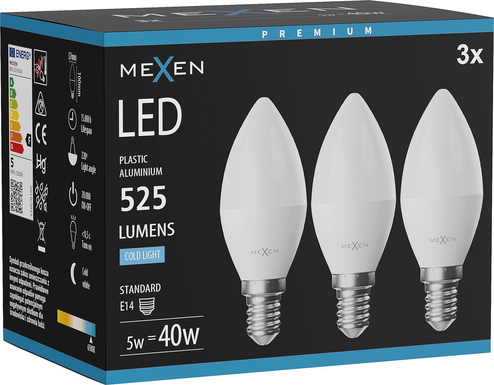Mexen Nova 3x LED lemputė E14, C37, 5W, Šalta - 6500K, 525 lm - L102-E14-0565-01x03