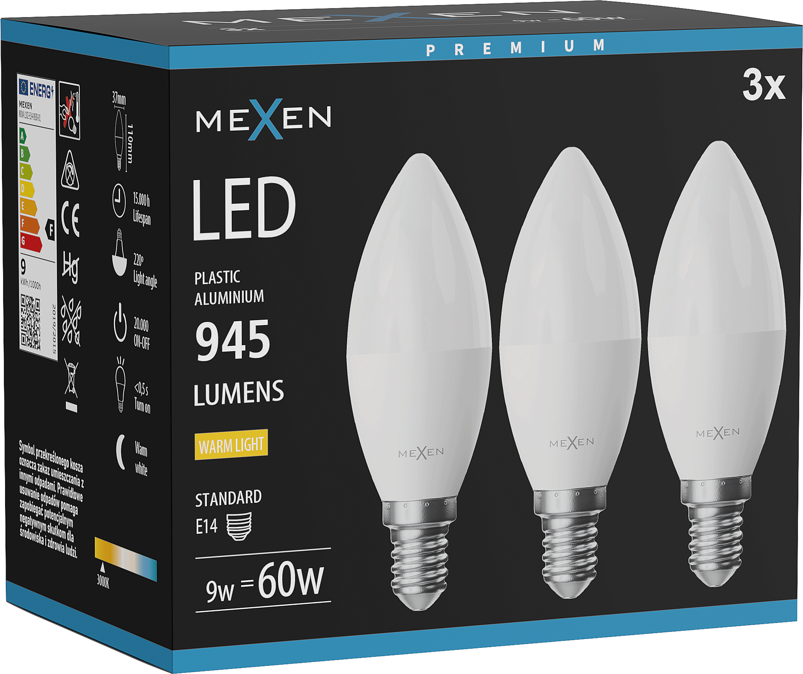 Mexen Nova 3x LED lemputė E14, C37, 9W, Šilta - 3000K, 945 lm - L102-E14-0930-01x03