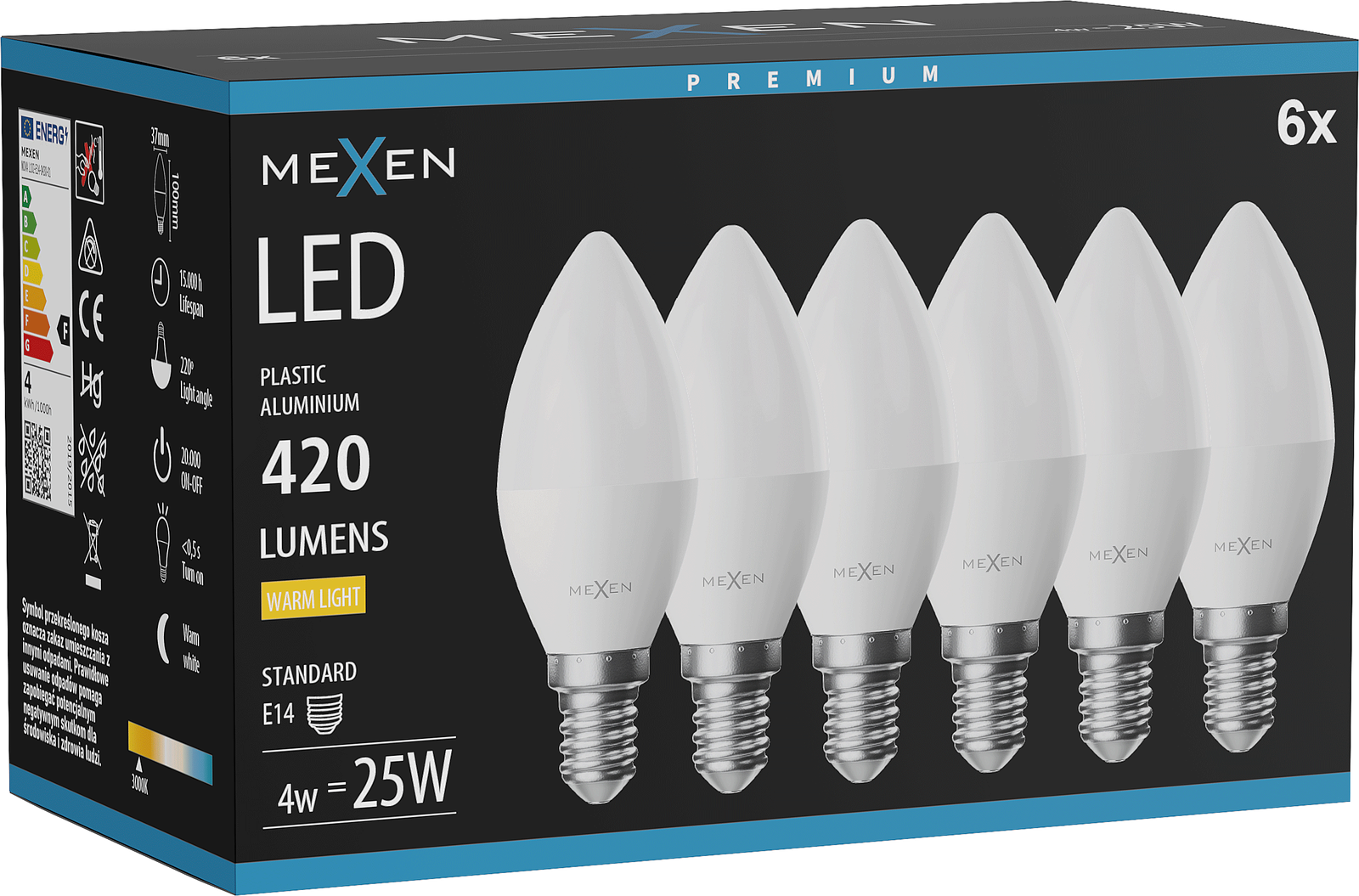 Mexen Nova 6x LED lemputė E14, C37, 4W, Šilta - 3000K, 420 lm - L102-E14-0430-01x06