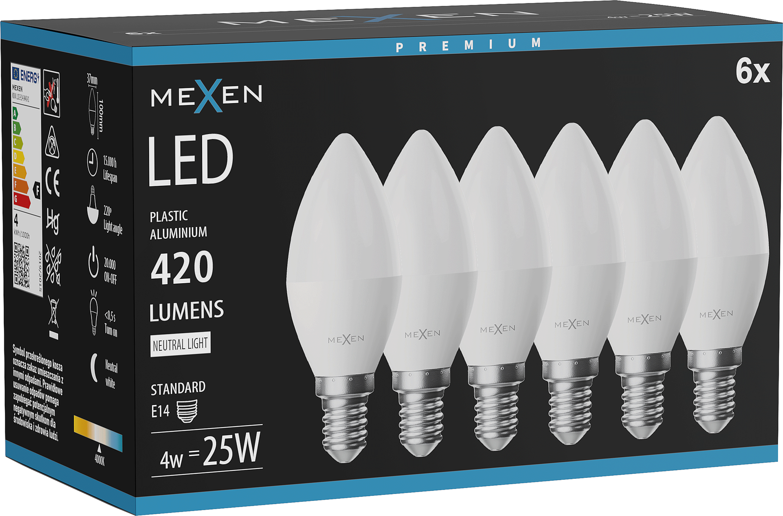 Mexen Nova 6x LED lemputė E14, C37, 4W, Neutrali - 4000K, 420 lm - L102-E14-0440-01x06