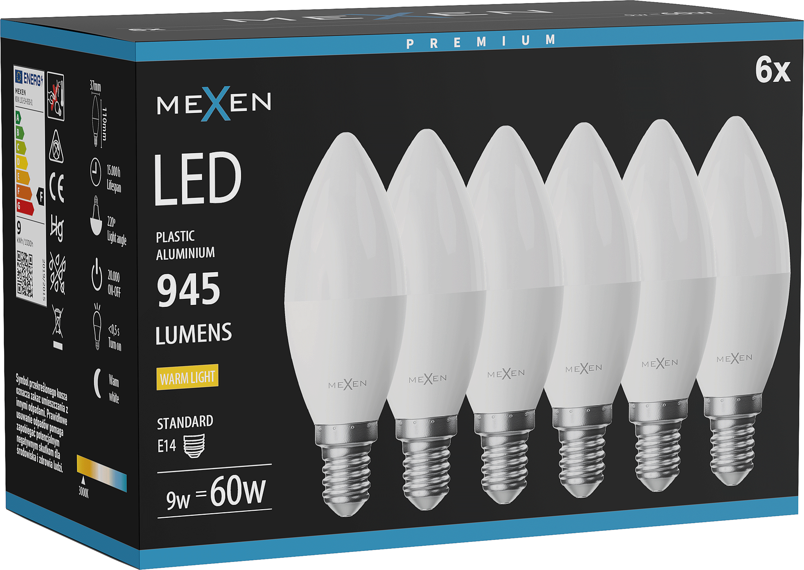 Mexen Nova 6x LED Lemputė E14, C37, 9W, Šilta - 3000K, 945 lm - L102-E14-0930-01x06