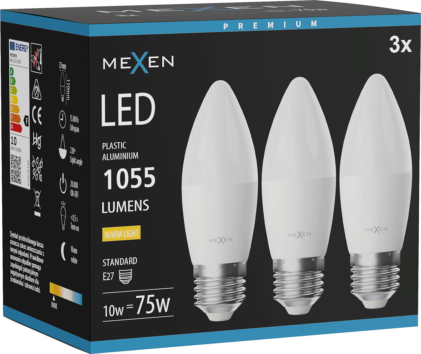 Mexen Nova 3x LED lemputė E27, C37, 10W, Šilta - 3000K, 1055 lm - L102-E27-1030-01x03
