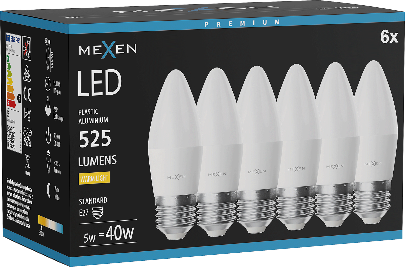 Mexen Nova 6x LED lemputė E27, C37, 5W, Šilta - 3000K, 525 lm - L102-E27-0530-01x06