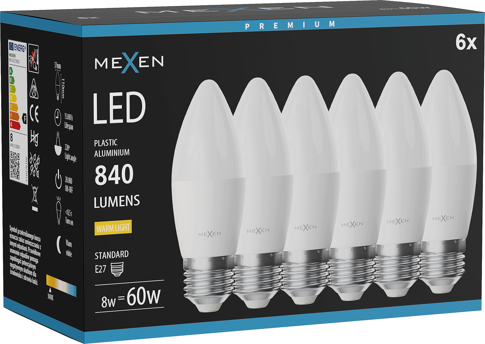 Mexen Nova 6x LED lemputė E27, C37, 8W, Šilta - 3000K, 840 lm - L102-E27-0830-01x06