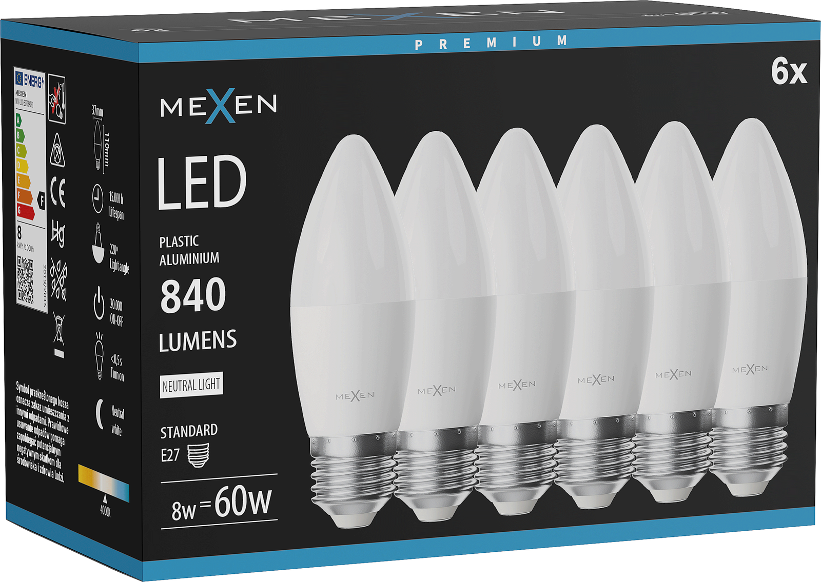 Mexen Nova 6x LED lemputė E27, C37, 8W, Neutrali - 4000K, 840 lm - L102-E27-0840-01x06