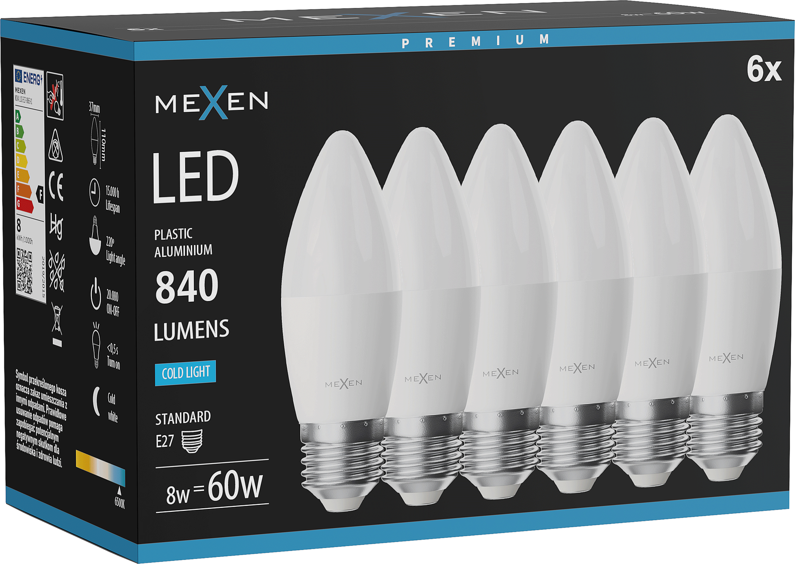 Mexen Nova 6x LED lemputė E27, C37, 8W, Šalta - 6500K, 840 lm - L102-E27-0865-01x06