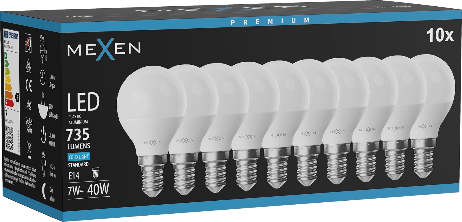 Mexen Nova 10x LED lemputė E14, G45, 7W, Šaltai balta - 6500K, 735 lm - L101-E14-0765-01x10