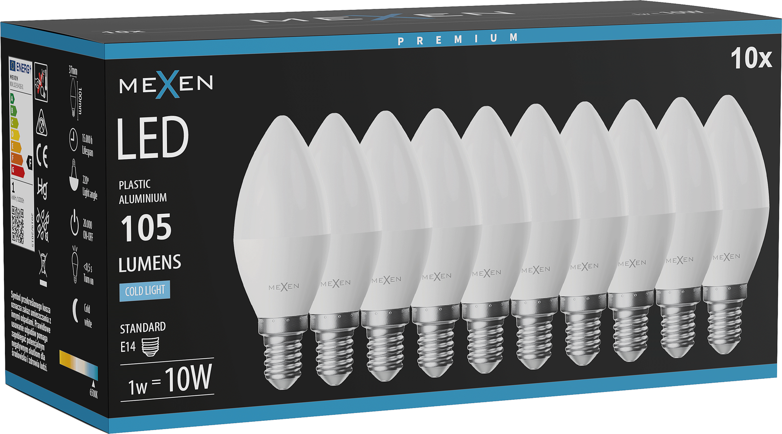 Mexen Nova 10x LED lemputė E14, C37, 1W, Šalta - 6500K, 105 lm - L102-E14-0165-01x10