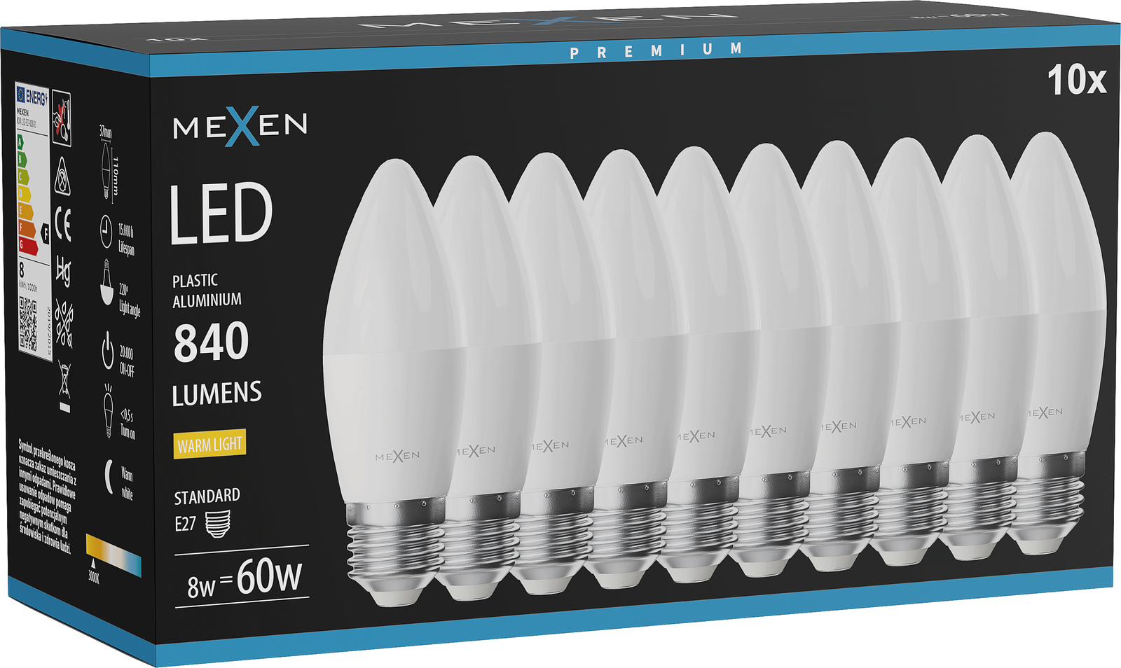 Mexen Nova 10x LED lemputė E27, C37, 8W, Šilta - 3000K, 840 lm - L102-E27-0830-01x10