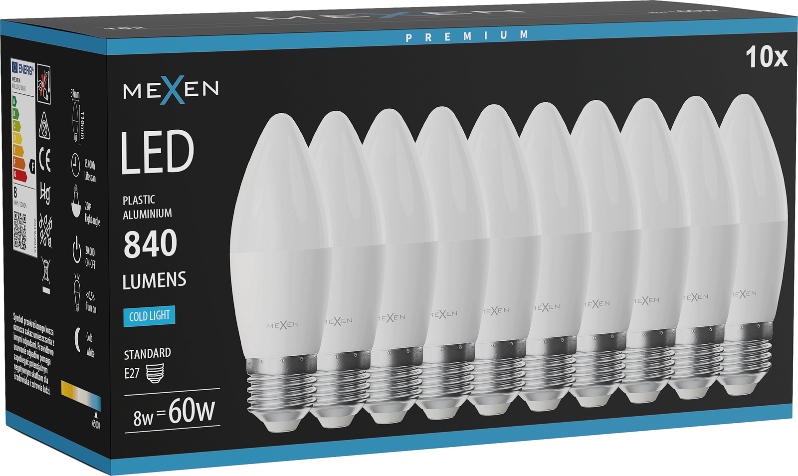 Mexen Nova 10x LED lemputė E27, C37, 8W, Šaltas - 6500K, 840 lm - L102-E27-0865-01x10