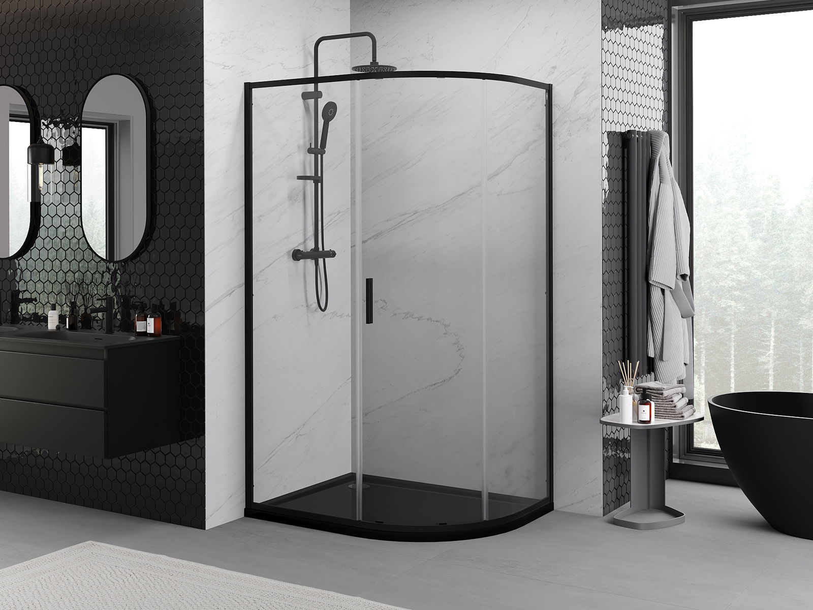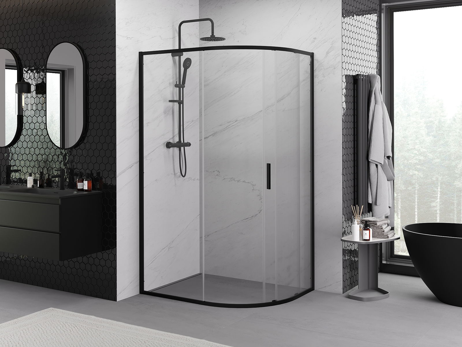 Mexen Exo asimetriška išlenkta stumdoma dušo kabina 120 x 80 cm, skaidri, juoda - 8131-120-080-70-00