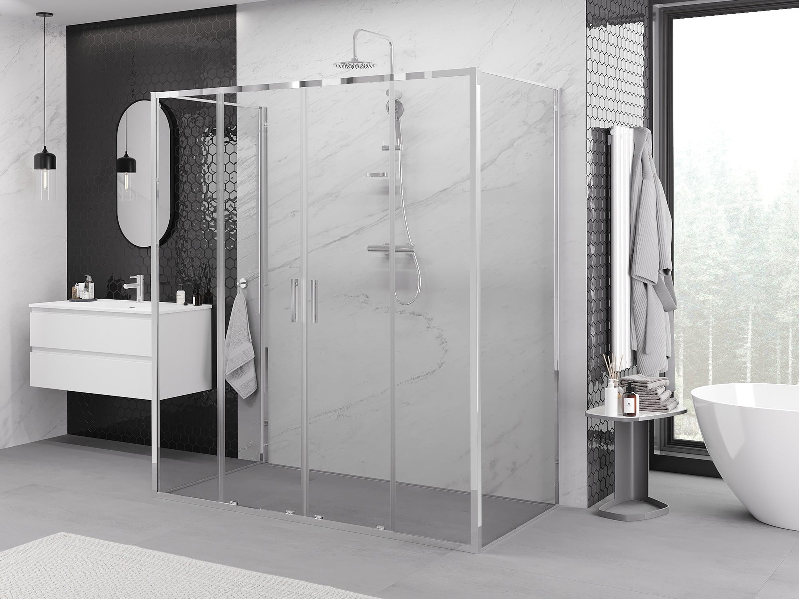 Mexen Exo-3S yra šiuolaikinė trijų sienų dušo kabina, kuri derina stilių ir funkcionalumą. Dėl savo dydžio 180x95 cm ir 200 cm aukščio, puikiai tinka įvairioms vonioms. Universalus montavimas ir galimybė montuoti ant padažo arba plytelių suteikia universalumą. Permatomas grūdintas stiklas, kurio storis 6 mm, su chromuota apdaila prideda elegancijos, o danga, palengvinanti valymą ir pločio reguliavimas padidina naudą. Kabina yra su stumdomomis durimis, aliumininiu slenksčiu, metaline rankena ir vandeniui atspariomis tarpinėmis, kas garantuoja komfortą ir patvarumą.