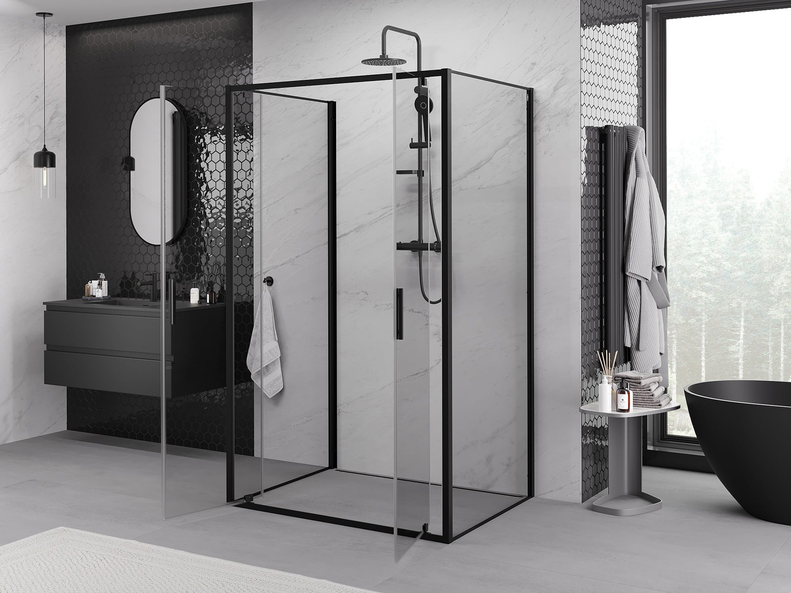 Mexen Exo-3S trijų sienelių dušo kabina atidaroma 90 x 110 cm, permatoma, juoda - 8182-090-110-70-00-3S