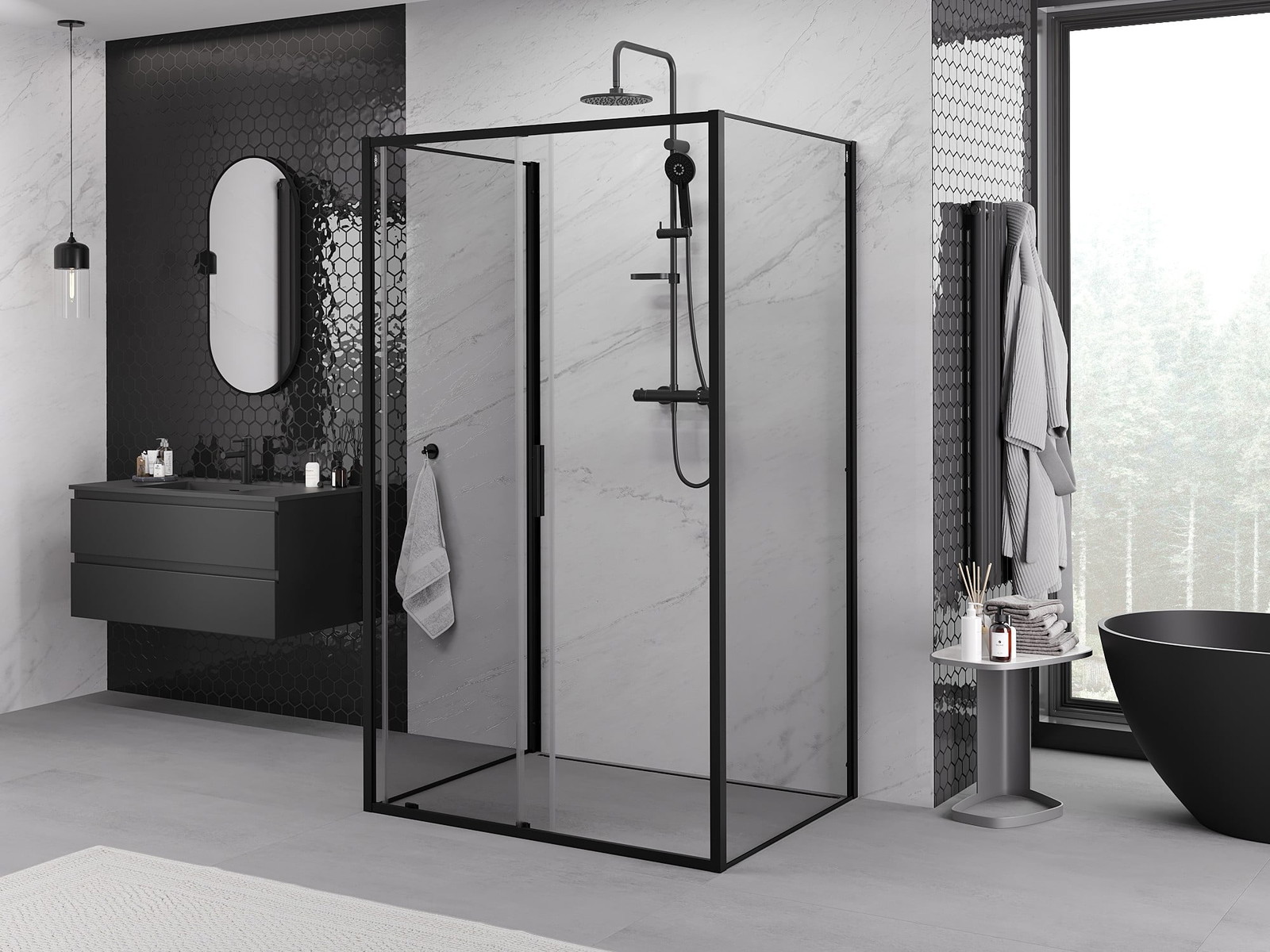 Mexen Exo-3S trijų pusių dušo kabina su slankiosiomis durimis, 190 x 120 cm, skaidrus stiklas, juoda - 8151-190-120-70-00-3S