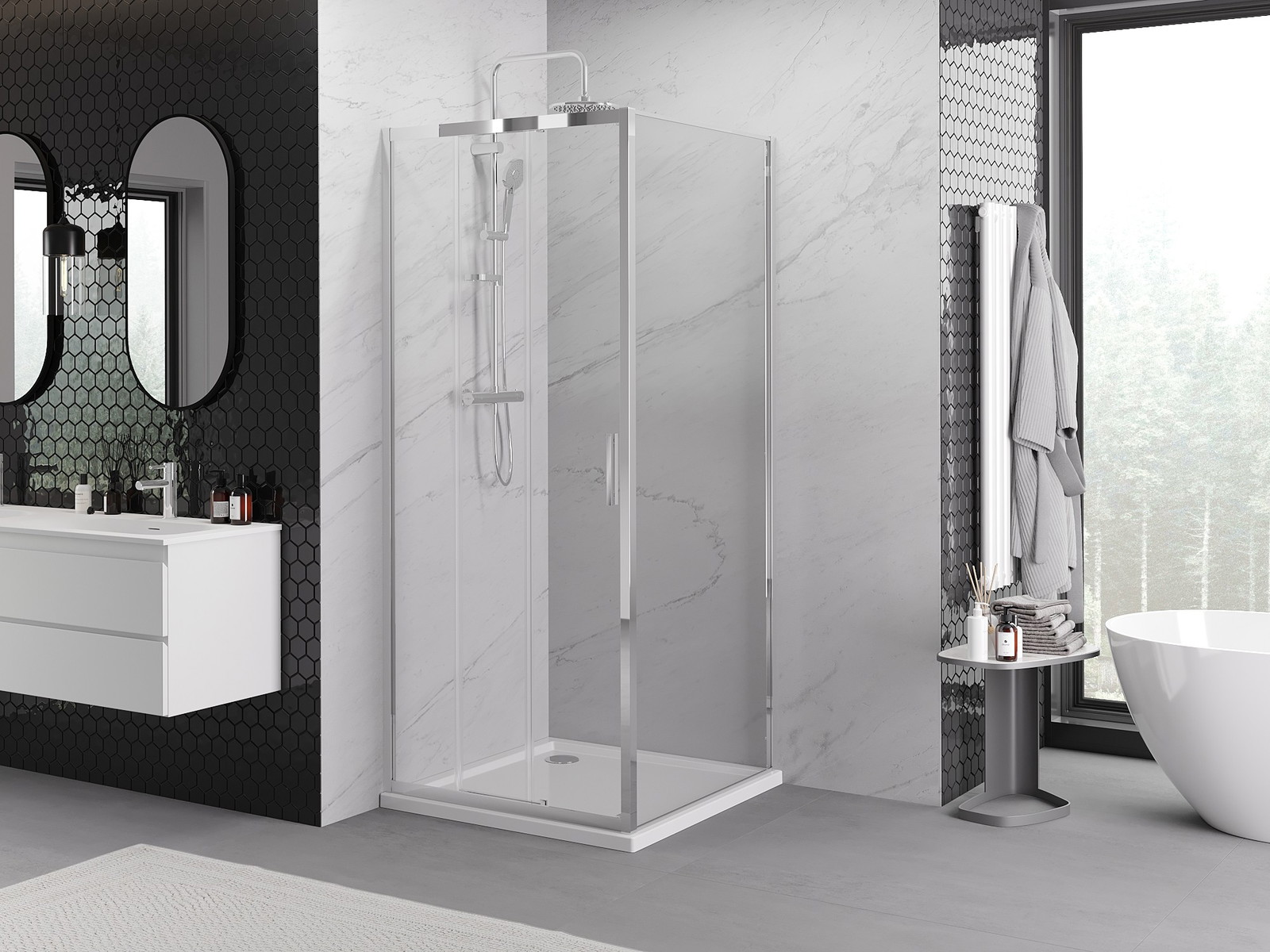 Mexen Exo yra stumdomas dušo kabina, kurios matmenys 95x95 cm, puikiai tiks bet kuriame vonios kambaryje. Ji pasižymi universaliu montavimu ir reguliuojamu pločiu, kas leidžia puikiai prisitaikyti prie interjero. 6 mm storio grūdinto stiklo stumdomos durys ir aliuminio profilis užtikrina ilgaamžiškumą ir stabilumą. Chromuota apdaila ir skaidrus stiklas suteikia elegancijos, o danga, palengvinanti valymą, užtikrina naudojimo patogumą. Kabina gali būti montuojama tiek ant dušo padėklo, tiek ant plytelių, todėl ji yra labai funkcionali. Dėl metalinės rankenos ir pilno komplekto vandeniui atsparių tarpinių, tai yra puikus sprendimas žmonėms, vertinantiems kokybę ir šiuolaikinį dizainą.