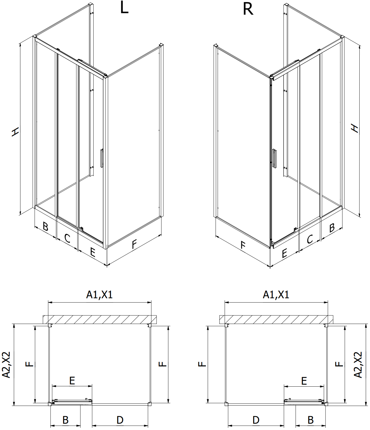Dušo kabinos, durys ir sienelės yra standartiškai pritaikytos montuoti ant nustatytų matmenų dušo padėklų. Būtent šie matmenys nurodomi gaminio pavadinime arba aprašyme. Tačiau atkreipkite dėmesį, kad faktiniai elementų matmenys gali šiek tiek skirtis nuo vardinių verčių. Planuojant montuoti tiesiai ant grindų, rekomenduojama atidžiai patikrinti išorinius matmenis ir elementų išdėstymą pagal techninį brėžinį.